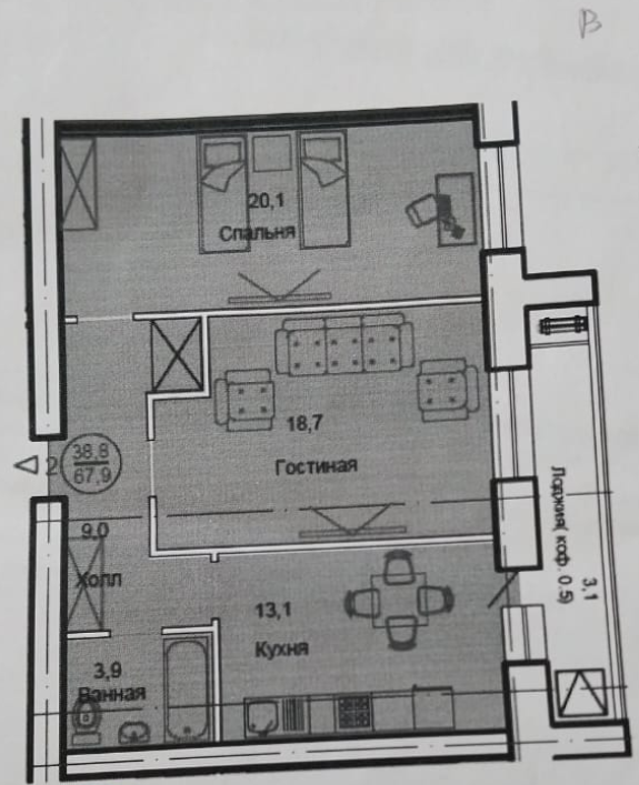 1 комнатная квартира 40.29 кв2
