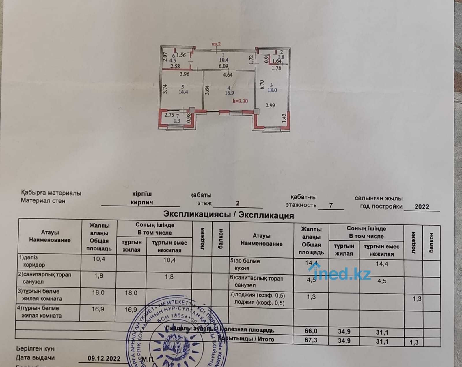 2 комнатная Квартира 67.3 кв/м